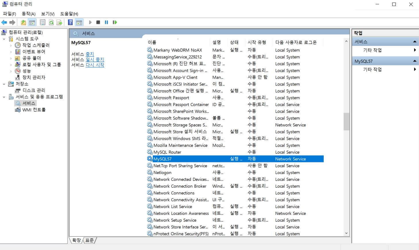 MySQL57이라는 놈이 실행 되어져 있다.