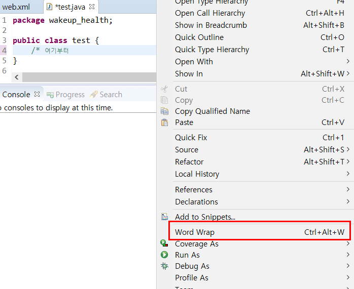 마우스 오른쪽 클릭하여 Word Wrap 클릭!!!