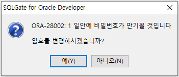 위와 같이 EXPIRED 만료됨으로 상태가 바뀌게 되고 DB접속은 ORA-28001 비밀번호가 만료되었다는 메세지가 나타난다.